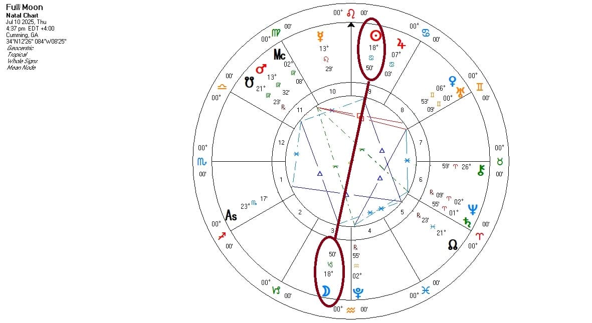 The Full Moon for July will occur on the 10th at 18 degrees and 50 minutes in the sign of Capricorn. In my Eastern Standard Time zone it will happen at 4:37 pm.