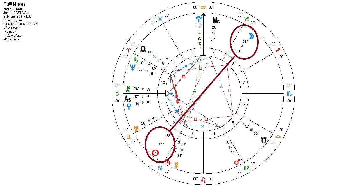 The Full Moon for June will occur on the 11th at 20 degrees and 39 minutes in the sign of Sagittarius. In my Eastern Standard Time zone it will happen at 3:44 am.