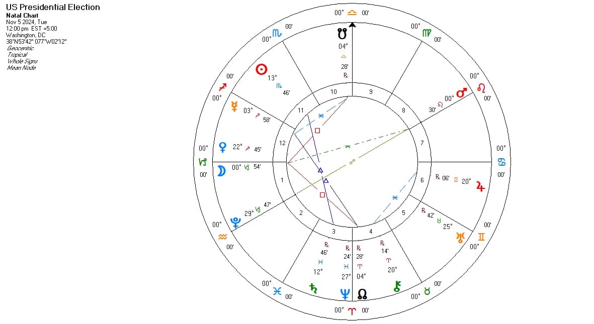 The US election takes place over the course of the day, November 5, 2025. Therefore, I have cast the chart for 12:00 pm, using Washington, DC as the location.