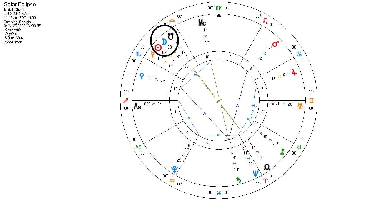 The Solar Eclipse in Libra happening in the 11th House of the United States chart during a Balsamic Moon phase. This placement suggests a profound period of reflection, release, and preparation for a new cycle in the nation’s collective vision. The 11th House, associated with alliances, social networks, and future ideals, gets all the attention. However, the Balsamic Moon’s waning energy calls for letting go of outdated alliances, ideologies, or social constructs. Many traditional beliefs and practices no longer serve the nation’s higher purpose. Consequently, this eclipse encourages a recalibration of relationships and policies, particularly those that affect the collective. The focus will be on healing divisions and fostering unity. But first, the old ways of doing things will have break or fall apart.