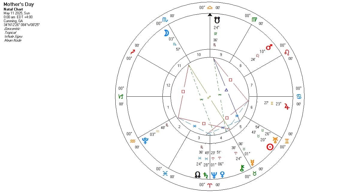 Now let’s take a look at the astrology chart cast for Mother’s Day. Mother’s Day falls on the second Sunday of May every year. Through the lens of astrology, we’ll explore the cosmic energies at play during this day.