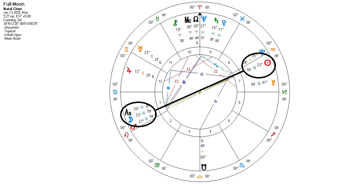 With this January 2025 Full Moon at 23d59m, the Sabian Symbol is 24 Cancer, “A woman and two men on a bit of sunlit land facing south.” Marc Edmund Jones says, “This is a symbol of the soul’s necessary decisiveness in the basic allegiances of life, here emphasized in the terms of practical or everyday relations. There must be a mediation between the competing demands for immediate attention to various transient needs, and for some consistent or over-all goal which will bring an individual’s efforts into a cohesive pattern. The inner capacities must be disciplined continually for the sake of a plethora of outer opportunities.” The key word is: INCEPTION.