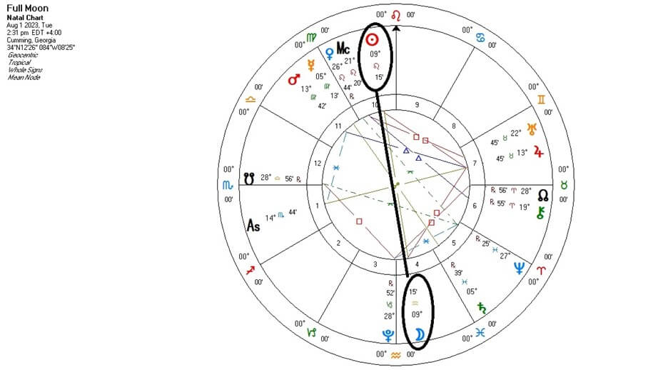 La Luna Llena se producirá en un lugar concreto de tu carta y en relación especial con varios puntos de tu carta si tienes puntos cerca del mismo grado en el mismo signo, en el grado opuesto (a 180 grados de un punto de tu carta), tres signos antes o después del grado y signo de la Luna Llena (a 90 grados), o cuatro signos antes o después del grado y signo de la Luna Llena (a 120 grados).
