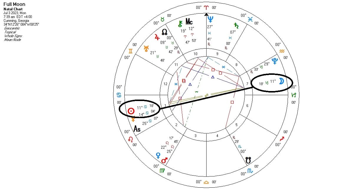 Esta Luna Llena tendrá lugar en el decanato (10 grados medios) de Capricornio, lo que la convierte en una Luna Llena de Capricornio/Tauro. Las influencias planetarias implican a Saturno como regente de Capricornio y a Venus como regente de Tauro. Así pues, esta Luna Llena tratará de lo que hacemos para alcanzar un estatus en la vida (Capricornio) y de cómo establecemos nuestra seguridad (Tauro). Como la Luna está en Capricornio, su energía es productiva, orientada a objetivos y seria. Esta Luna Llena nos va a exigir que reflexionemos sobre lo que más necesitamos hacer para tener éxito. La intensidad de esta Luna Llena en torno a las habilidades que necesitamos para prosperar no puede enfatizarse lo suficiente. Gracias a la colocación en decanos, esta Luna Llena tratará de cómo necesitamos ser productivos (Capricornio) para cuidar de nosotros mismos y de los demás (Sol en Cáncer) a través de nuestra necesidad de acumular los recursos necesarios para sentirnos seguros (Tauro). Con esta Luna Llena a las 11d18m, el Símbolo Sabiano es 12 Tauro, «Escaparates». Jones dice: «Se trata de un símbolo de la imaginación humana como verdadero corrector de la experiencia del hombre, que permite a cada individuo saber de antemano si las elecciones que hará se ajustan a sus deseos». En el simbolismo pasivo está implícita la exigencia continua de que la acción siga a cada examen tentativo de las posibilidades de la vida, y que como resultado se acelere en la conciencia alguna fase latente de la autoconciencia.» La palabra clave es: VISUALIZACIÓN.