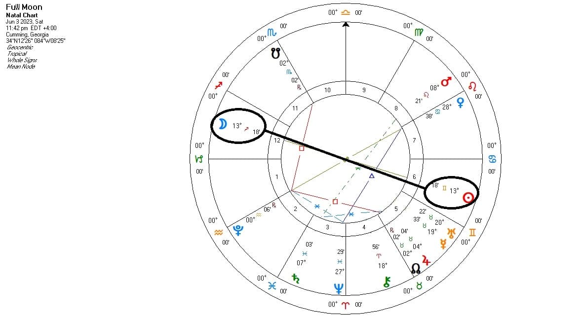 Con esta Luna Llena, recibo el impacto de su energía en mi Casa2 de los Recursos (colocación de la Luna el 03/06/2023) y en mi Casa8 de las Relaciones Íntimas (colocación del Sol entre el 19/05 y el 20/06), así que esta Luna Llena me dará energía para examinar mis creencias sobre lo que necesito para cuidarme (Sagitario rige mi Casa2 ) y cómo afecta a mi relación íntima (Géminis rige mi Casa8 ).