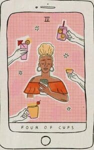 Del folleto: Si buscas una relación, el Cuatro de Copas muestra desilusión. Esta carta suele aparecer si te han hecho daño en el pasado y te proteges con una lista de control, rechazando instantáneamente a cualquiera que no esté a la altura de tus exigentes estándares: es hora de arriesgarse a abrirse emocionalmente de nuevo (22).