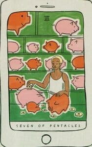 Del folleto: Tienes un objetivo a la vista y estás cerca de conseguirlo, pero ahora no es el momento de pararte a reflexionar. El Siete de Pentáculos es la carta del hacer, no del filosofar, así que mantente centrado en lo que quieres y cree que puedes conseguirlo (31).