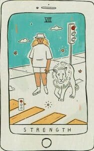 Del folleto: La carta de la Fuerza representa la autoorientación y la confianza en uno mismo. Es hora de hacer acopio de valor y determinación para controlar la situación. Recuerda actuar con gracia y sensibilidad en lugar de utilizar la fuerza bruta (14).