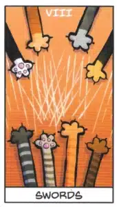 Mensaje: El 8 de Espadas representa sentimientos de confinamiento o restricciónóna menudo debido a limitaciones autoimpuestas o al miedo. Te insta a reconocer que los obstáculos a los que te enfrentas pueden no ser tan insuperables como parecen. Cambiando de perspectiva y actuando con decisión, puedes liberarte de las ataduras mentales que te frenan.