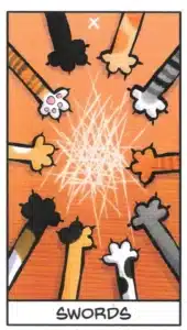 Mensaje: El 10 de Espadas señala un final doloroso o un periodo de dificultades. Pero también marca el final de un ciclo difícil. Aunque pueda parecer abrumador, esta carta te anima a reconocer el dolor y a dejarlo ir. En consecuencia, allana el camino para nuevos comienzos y la oportunidad de sanar.
