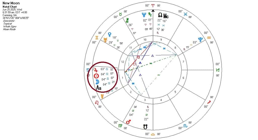 La Nouvelle Lune du Cancer aura lieu le25 juin à 04 degrés et 07 minutes. Dans mon fuseau horaire de l’Est, elle se produira à 6h31.