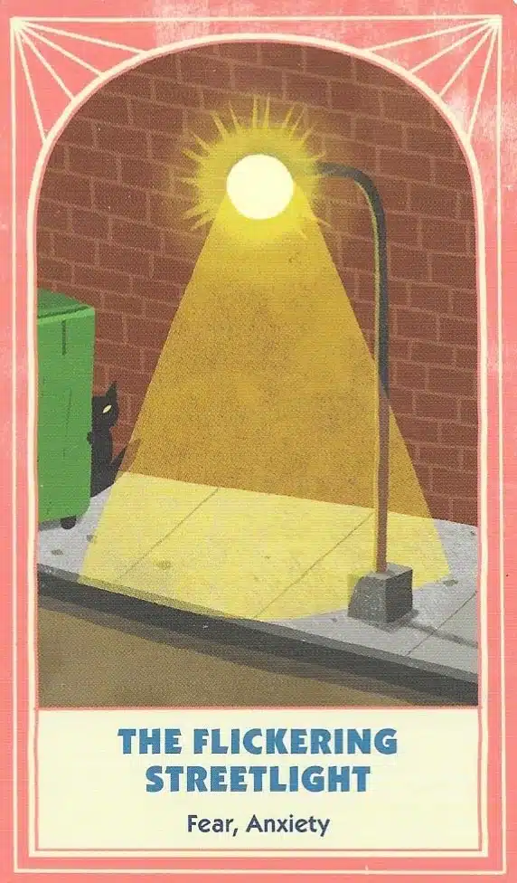 Mesures à prendre : Le lampadaire clignotant indique qu’il est temps d’affronter la peur et l’anxiété en toute connaissance de cause. Reconnaissez ce qui vous perturbe sans porter de jugement. Allumez une bougie, écrivez vos inquiétudes, puis brûlez le papier en toute sécurité, libérant ainsi symboliquement la peur. Ce rituel permet de retrouver le calme et le pouvoir personnel.