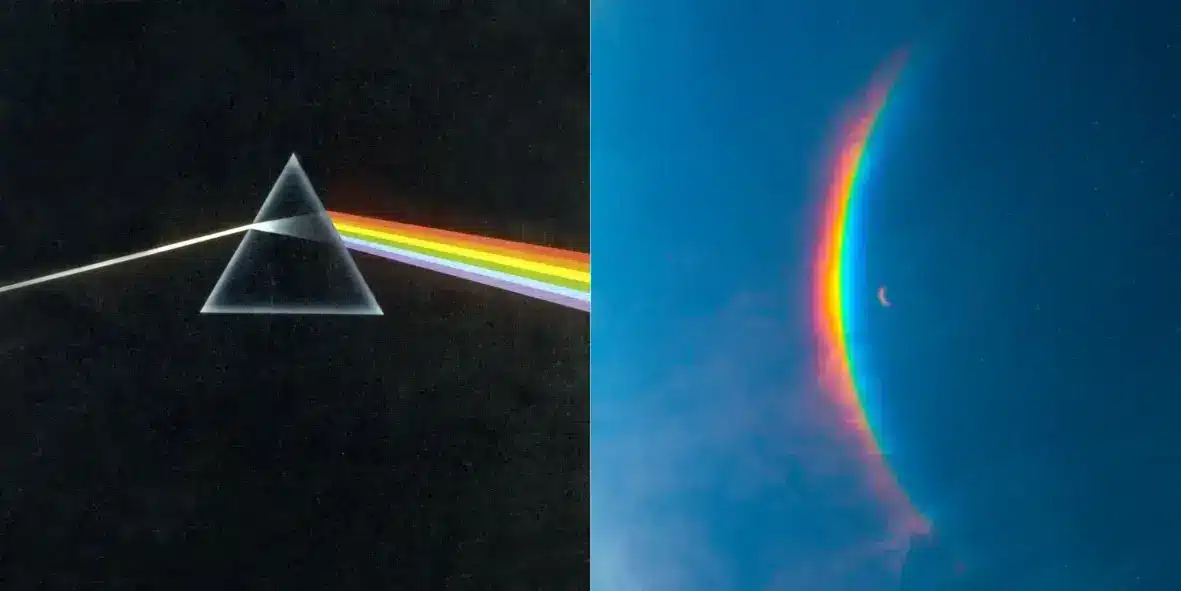 On one hand, there’s a blue sky with a rainbow moonbow, and on the other, a black sky containing a prism dispersing rainbow light. Like opposites, one side and the other side of the Moon.