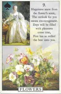 The Flowers card in the Lenormand deck symbolizes joy, beauty, appreciation, and pleasant surprises. It often represents gifts, invitations, and happy social interactions. In readings, it brings positive energy and encourages gratitude for life’s small blessings. Moreover, Flowers signals reconciliation, renewed harmony, or opportunities to share kindness. In relationship readings, it highlights romantic gestures and warm connections. Additionally, in career matters, it can indicate recognition, compliments, or rewarding collaborations. Therefore, this card reminds you to embrace optimism and share your light with others. Ultimately, the Flowers card invites you to celebrate life’s simple joys and appreciate heartfelt connections.