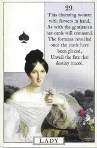 The Lady card in the Lenormand deck represents a significant woman or the feminine aspect of a situation. It often points to intuition, receptivity, and personal relationships. In readings, it can signify the querent herself or a key female influence. As well, the Lady highlights empathy, emotional awareness, and nurturing qualities in life’s events. In relationships, it emphasizes love, care, and meaningful connections. In career or personal growth, it encourages collaboration and balanced decision-making. Therefore, this card reminds you to honor intuition and heartfelt perspectives. Finally, the Lady card highlights feminine energy guiding relationships, choices, and emotional well-being.