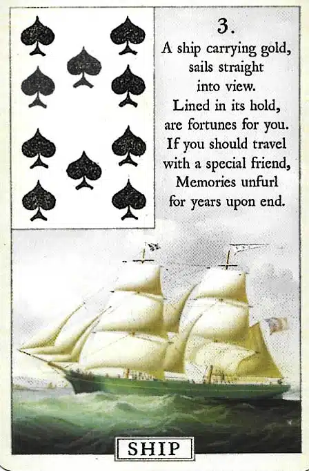Message: The Ship card in Lenormand represents travel, exploration, and new opportunities. As well, it signals movement, change, or expansion. In business, it highlights international or long-distance connections. Additionally, it encourages adventure, adaptability, and progress. Finally, the Ship card inspires forward motion, growth, and discovery.