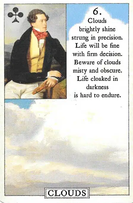 Message: The Clouds card in Lenormand represents confusion, uncertainty, and unclear situations. It signals misunderstandings or temporary setbacks; and in relationships, it highlights tension or miscommunication. As well, it encourages caution, reflection, and careful decision-making. The Clouds card warns to navigate ambiguity thoughtfully and patiently.