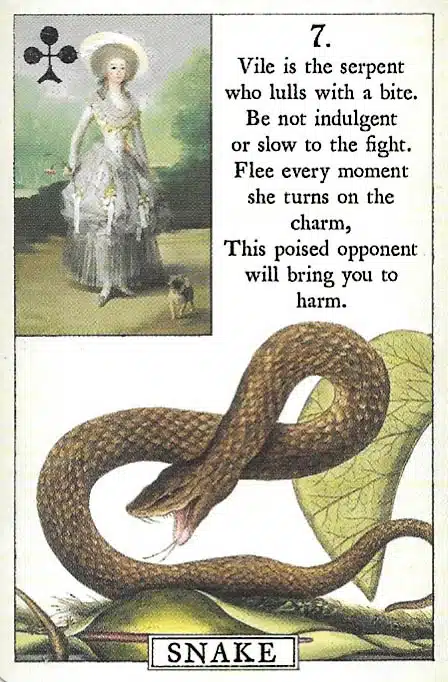 Action: When the Snake card appears, approach situations carefully, such as reviewing a contract thoroughly before signing. Observe others’ intentions and ask clarifying questions. Reflect on potential complications, maintain discernment, and trust your instincts, allowing cautious actions to protect your interests and prevent misunderstandings.