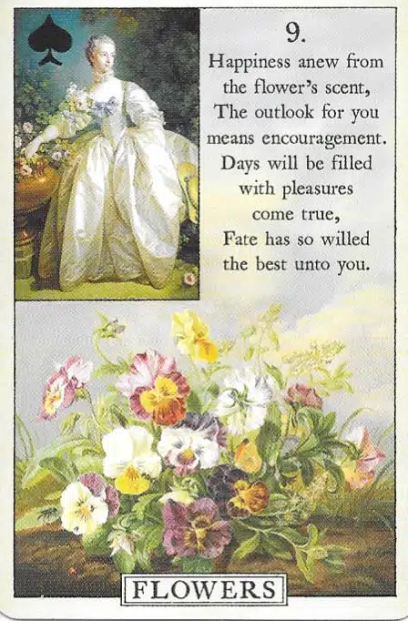 Message: The Flowers card in Lenormand represents joy, celebration, and positive recognition. Moreover, it signals gifts, compliments, or happy social interactions. In relationships, it highlights romance and harmony. Additionally, Flowers encourages gratitude and appreciation. Overall, it invites optimism, pleasant surprises, and the sharing of kindness.