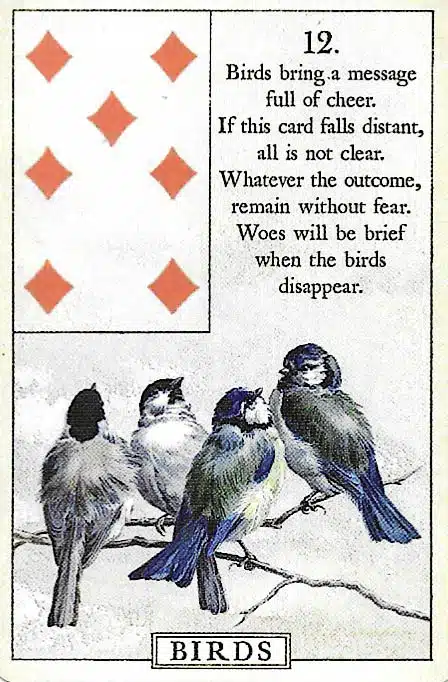 Message: The Birds card in Lenormand represents communication, social interaction, and dialogue. Moreover, it signals conversations, discussions, or meetings. In relationships, it highlights connection, networking, and exchange of ideas and encourages clarity, active listening, and collaboration. Overall, Birds inspire interaction, awareness, and shared understanding.
