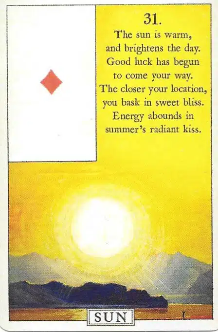 Message: The Sun card in Lenormand symbolizes success, vitality, and positive outcomes. Moreover, it brings confidence, clarity, and recognition. In relationships, it highlights happiness, support, and harmony. As well, in work or projects, it indicates growth, achievement, and rewarding progress. On the whole, it radiates optimism and triumph.